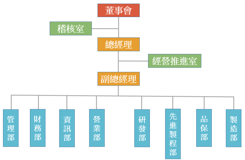 | 財務部 | 負責會計資料之蒐集、整理、記錄、分析報告及報表編製,營運資金之調度、運用,預算之編製。 |